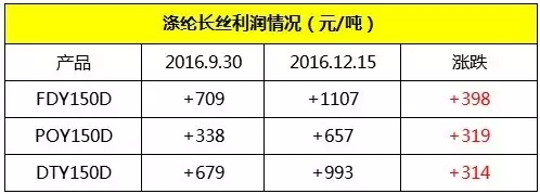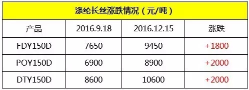 在石油輸出國組織(OPEC)承諾將產(chǎn)量削減120萬桶/日、產(chǎn)量上限設(shè)定為3250萬桶/日之后,我國滌綸長絲產(chǎn)品的價(jià)格可謂一路看漲。根據(jù)生意社監(jiān)測,12月19日,國內(nèi)滌綸長絲市場行情仍呈現(xiàn)走高態(tài)勢,廠家報(bào)價(jià)重心有所上調(diào),尤其是滌綸FDY,主流工廠報(bào)價(jià)重心集中上調(diào)100元/噸。江浙地區(qū)主流工廠滌綸POY150D/48F報(bào)8610~9000元/噸,DTY150D/48F(低彈)報(bào)10150~10700元/噸,F(xiàn)DY150D/96F報(bào)9450~9700元/噸。